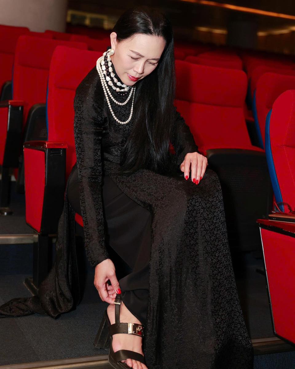 Chị khách của The Pearl kiêu sa, lộng lẫy trong trang phục áo dài lụa phối với ngọc trai của shop.