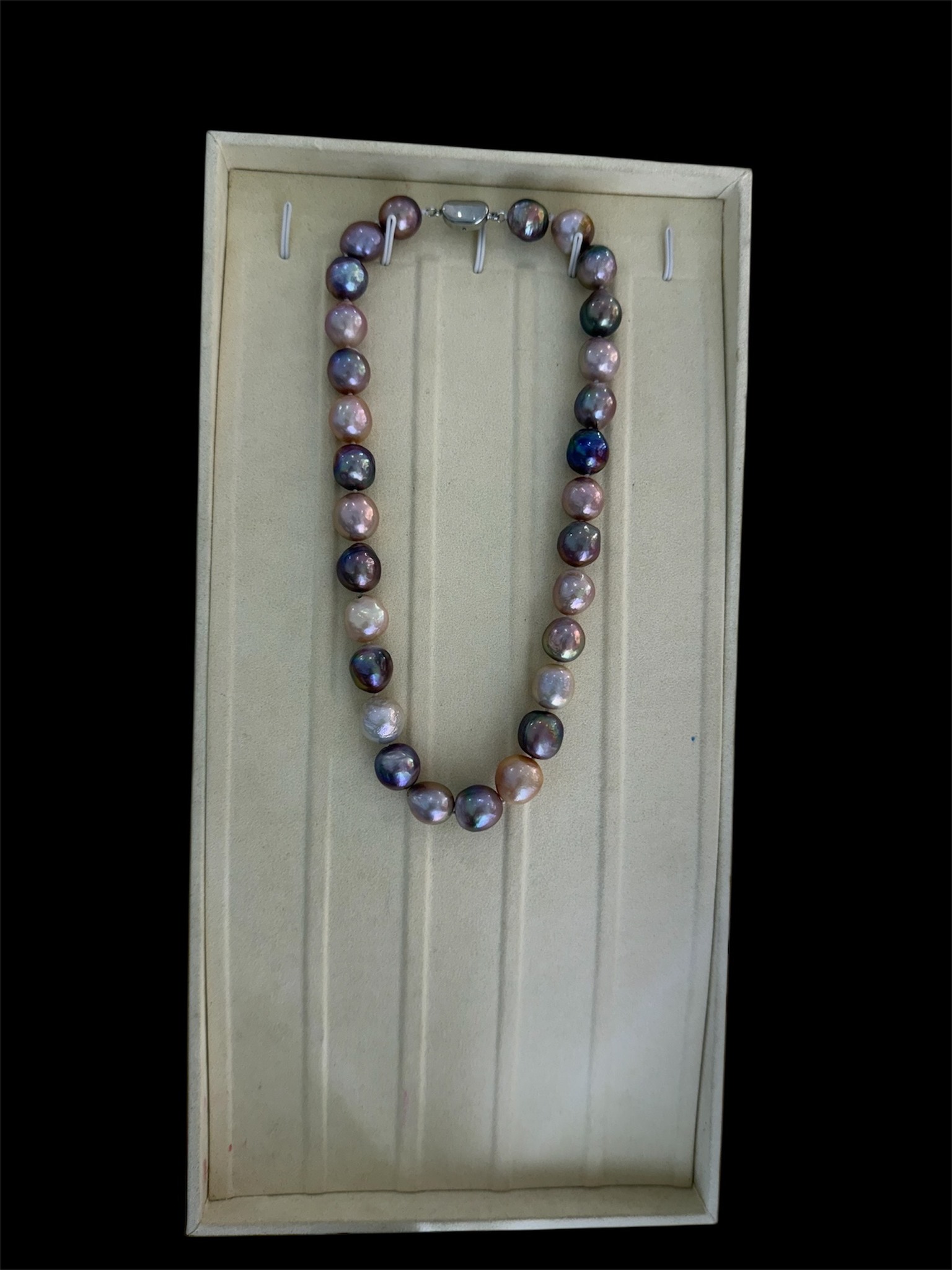 Không chỉ dừng lại ở sắc trắng truyền thống, ngọc trai màu hồng nhạt, tím lavender hay xám khói đang ngày càng phổ biến. Chúng mang lại chiều sâu, sự mới mẻ và tạo điểm nhấn bất ngờ. Ngọc trai ánh ngũ sắc lại đặc biệt nổi bật dưới ánh sáng, khiến tổng thể trang phục thêm phần sống động.