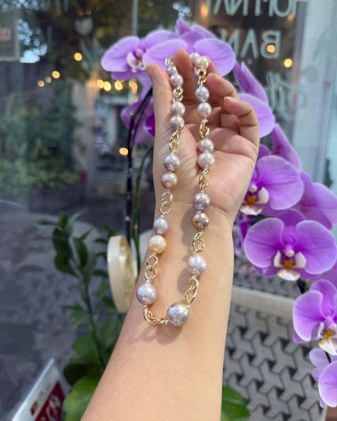 Rước ngay nhé các nàng. Xinh lắm đấy. Mà không những xinh mà còn sang. Màu ngọc thì ngọt ngào vô cùng. Ngọc trai Edison màu tím và màu cam. Size ngọc 11-12mm. Dài dây là 43cm luôn khoá.