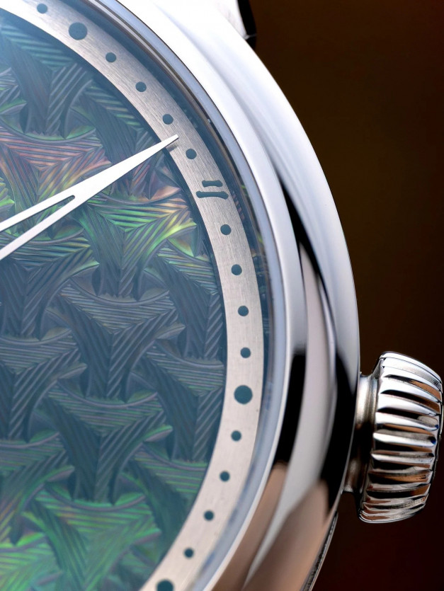 Điểm nhấn độc đáo của Jui 聚 nằm ở mặt số được chế tác từ ngọc trai đen Tahiti tự nhiên, loại vật liệu quý hiếm nổi bật với sắc xanh, tím, đỏ và xanh lam thay đổi theo góc nhìn. Từ nền xà cừ, Selten đã khắc họa hoa văn guilloché mô phỏng lớp áo giáp Trung Hoa cổ, vừa mang tính thẩm mỹ, vừa biểu tượng cho sự gắn kết và sức mạnh của cộng đồng sưu tầm.