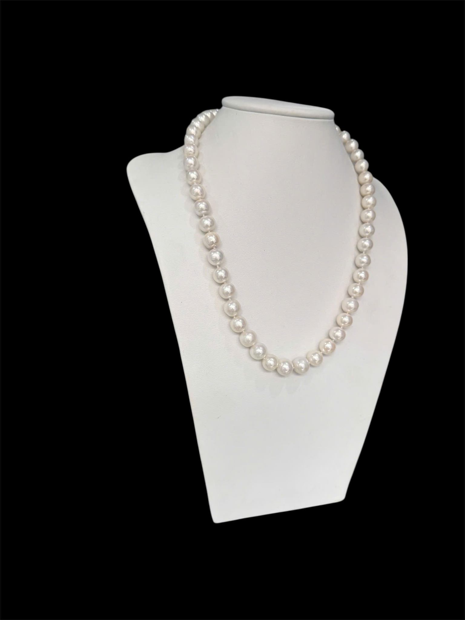 Ngọc trai Edison màu trắng tinh. Size 9-11mm. Dáng ngọc tròn và gần tròn. Dây là dáng ngọc lý tưởng dành cho các anh trai vượt ngàn chông gai. Bởi nếu viên ngọc tròn quá hoàn hảo, sẽ làm mất đi vẻ nam tính của các Quý ông.