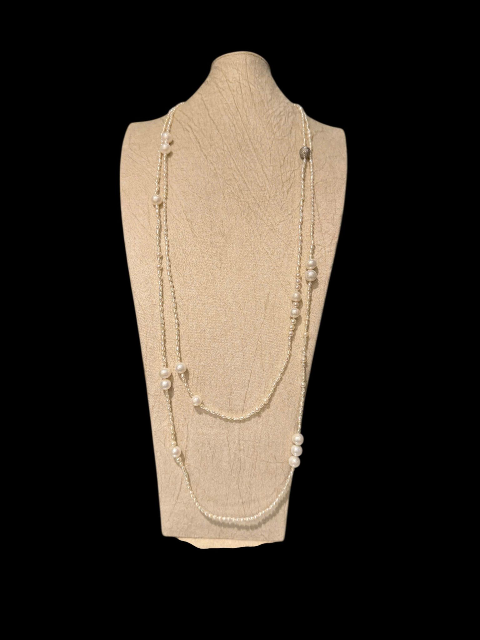 Chuỗi ngọc trai nước ngọt mix nhiều size ngọc và nhiều dáng ngọc, gồm: ngọc trai dáng hạt gạo + ngọc trai dáng tròn + ngọc trai dáng baroque. Tất cả cùng tạo nên một chiếc chuỗi ngọc trai đẹp rực rỡ, với kiểu dáng thiết kế mới lạ, thời trang và độc quyền. Đây là chiếc chuỗi được thiết kế độc quyền của The Pearl.