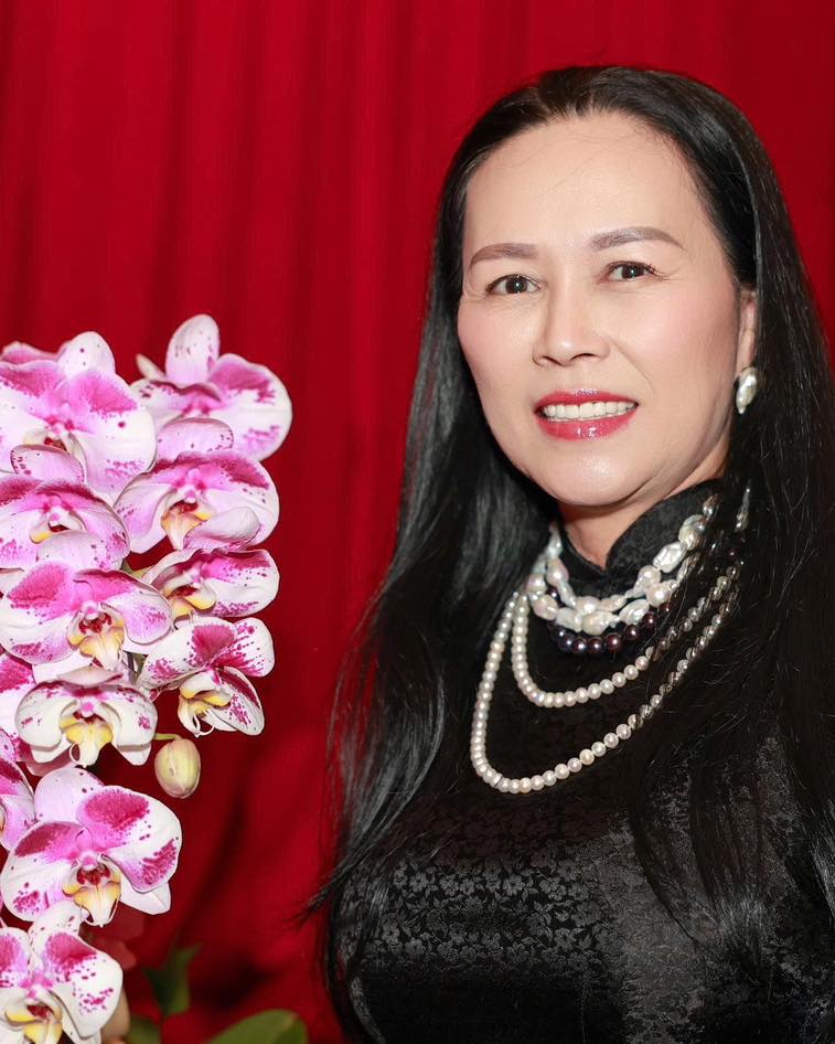 Chị khách của The Pearl kiêu sa, lộng lẫy trong trang phục áo dài lụa phối với ngọc trai của shop.